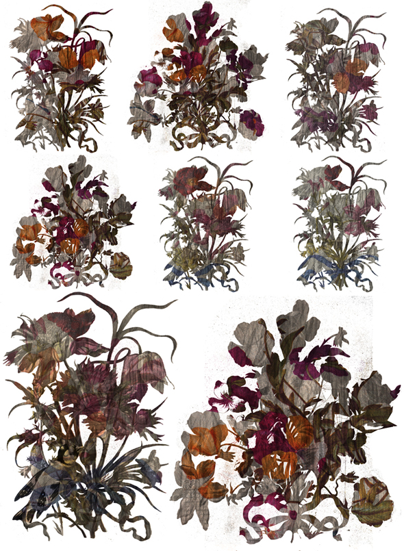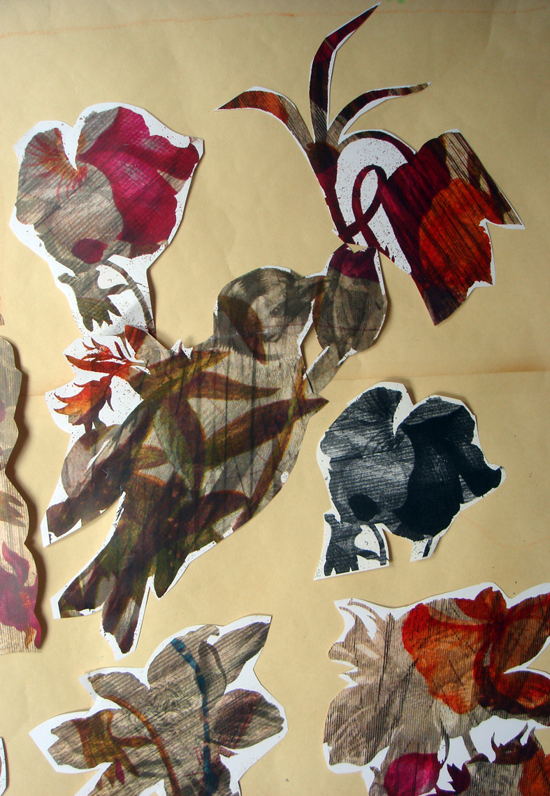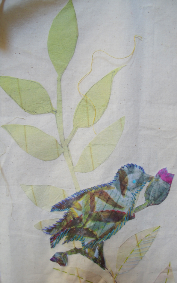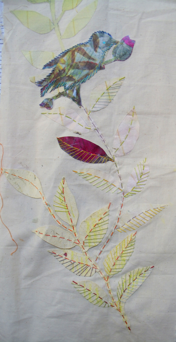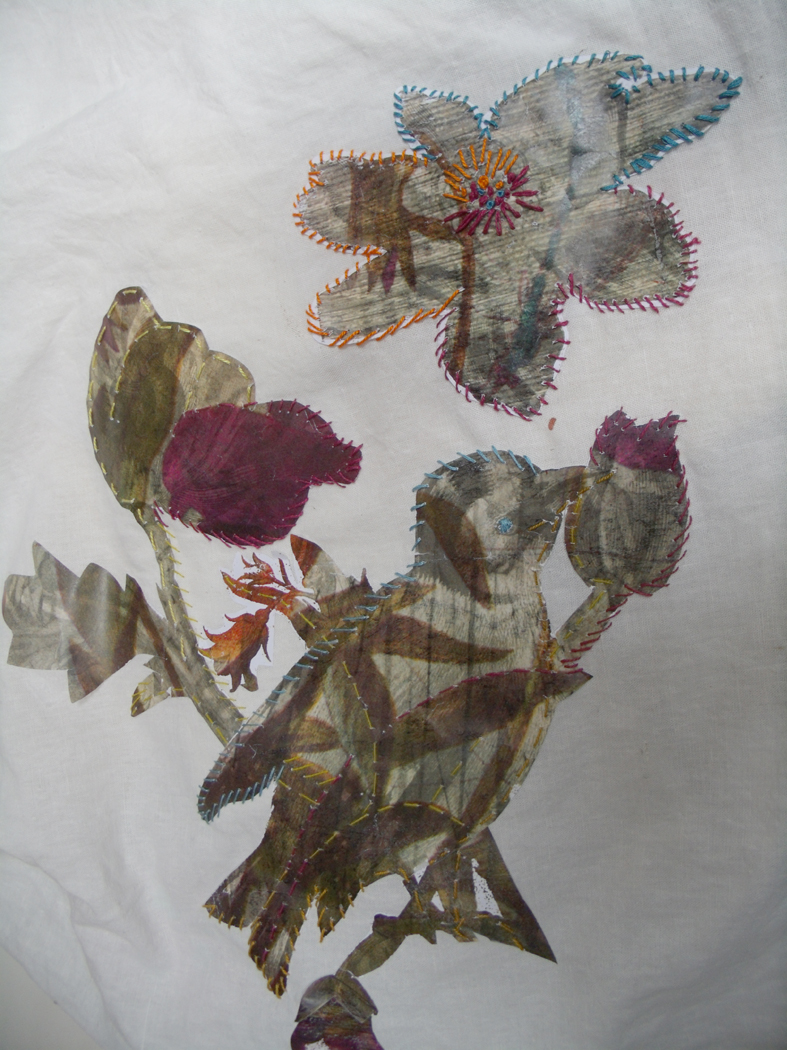 And as we are playing a game of consequences to make this work, in that we each react to the others new idea or image, I have to play by the rules and just make new ways to to do my stitched work within the time span. But what wonderful choices I am given, beautiful bouquets of exquisite flowers, some with hidden birds that I can cut out and embellish, but at the moment just working with paper makes the stitched results rather crude, but gives me ample opportunity to play with the colour and composition.