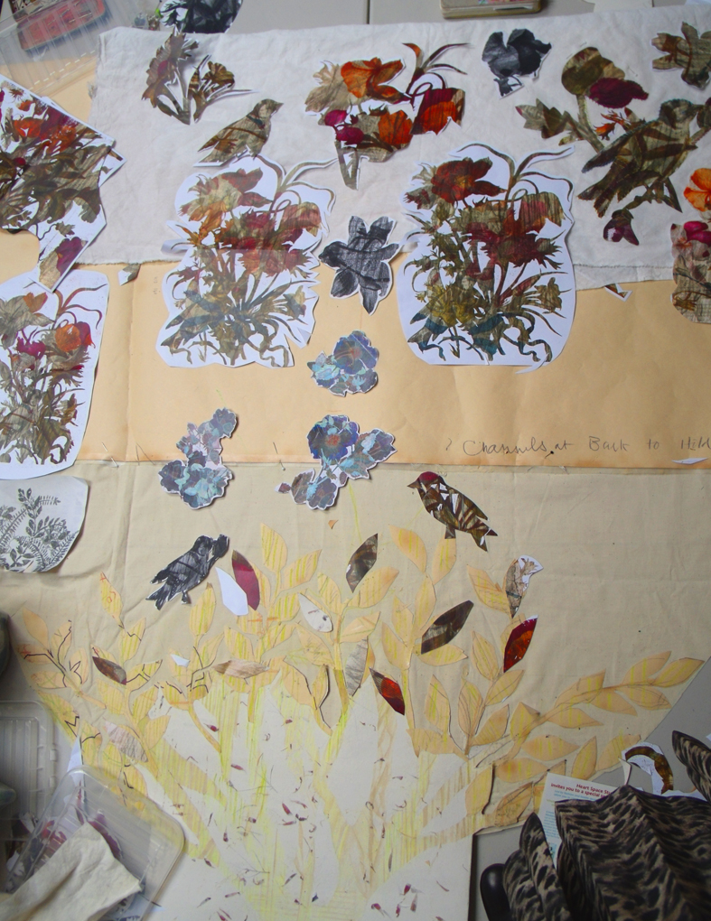 As a hand embroiderer I am used to developing my original design ideas as I make them. Working from a fairly comprehensive design drawing with stitched/dyed/fabricated samples, hand stitching then affords time to contemplate the work in progress, so subtle shifts of colour or even whole areas can be re-assessed – sometimes a piece of work can take several months of steady work to complete. The initial research is a fairly rapid process compared to the execution of the finished piece. Now I have to plot the whole piece in advance of starting the work so that I can calculate just how much stitching time will allow…we have hit on the idea of working with paper computer print-outs that Rachel send to me as she designs them -so that I can develop the design and get the scale sorted out, while we wait for the fabric to arrive to be printed and the departments to open up after Easter
