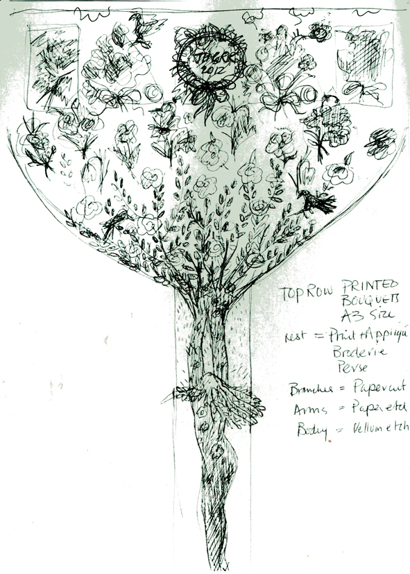 “Panic Early ” has been my making motto for many years and the advice I always handed to students at the beginning of any project with a set deadline….now it is my turn to heed my own advice. As a hand embroiderer the idea of stitching in a hurry is a total nightmare. So I tend to give myself a few days ‘wriggle room’ on any given deadline, I hate last minute making. So as my partner Rachel Kelly and I have about 3 more weeks to the deadline for a piece of work, I have decided to step up my input and get to grips with the rest of the tree design and sampling (with a plan B as well – watch this space) so that as soon as the Easter vacation is over we can just roll into the manufacture of the fabrics. The actual piece of work has been in the making for about 2 months now (see the last 2 posts) and the idea to make the Daphne Tree is at least 15 years old and I am about to see it come to fruition in the next 2 weeks, when it is due to be exhibited at a group exhibition called ‘Pairings’ the Museum in the Park in Sroud