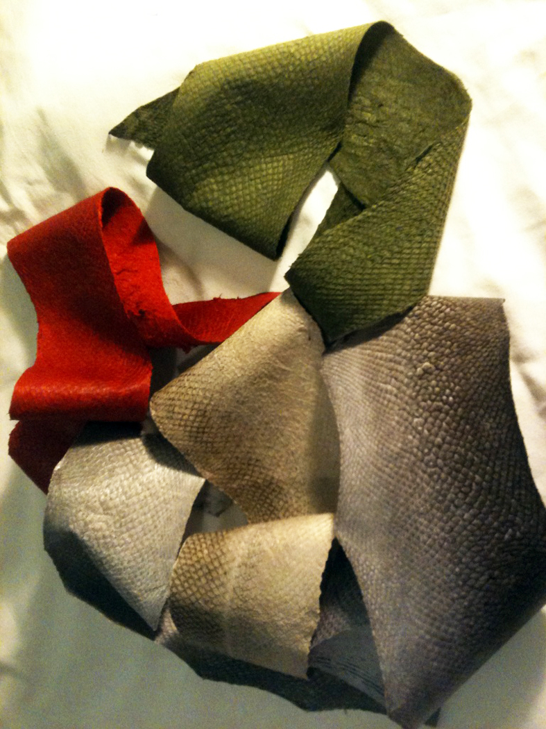 He is introducing this material for a master class for experienced makers, called Surf, Turf and Sky, using fish skins, leathers and feathers – all of which are by-products of the food industry, so think eel….