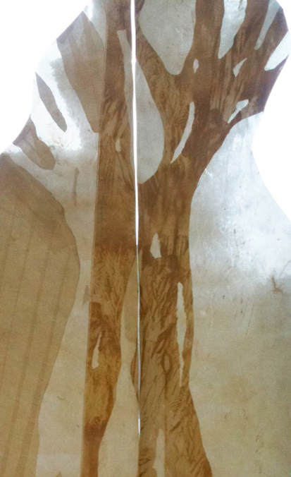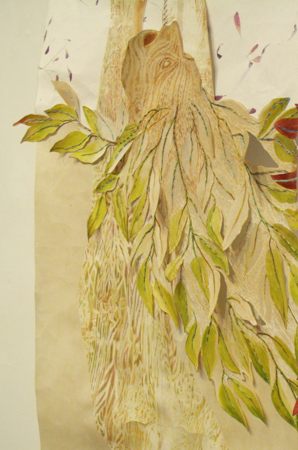 I have done quite a lot of work with fine leather and suede, most recently at a workshop in Finland at the University of Ostrobothnia, at the faculty of Applied Sciences, where I first experienced the large scale sheets of vellum as an option to work with. However I chose metallic leathers, cow hides and farmed fur to create an embroidered seascape, embellished with silver leaf. But I had remembered the large vellum skin and how beautiful it was and so used it for the Daphne Tree metamorphosis piece.