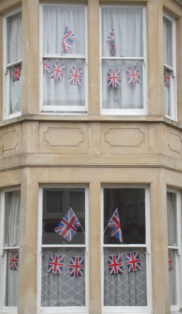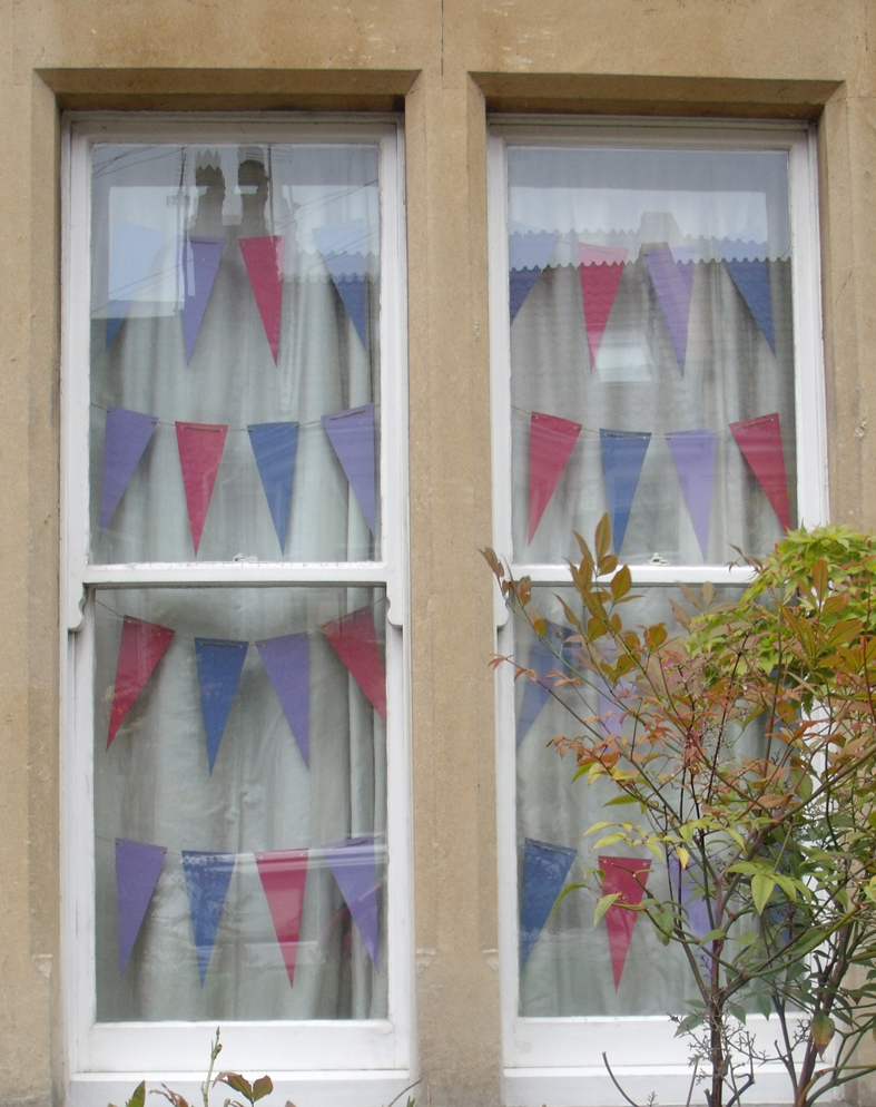 On the way to Bristol to work at Heart Space Studios, I kept stopping the car to take pictures of the patriotic red white and blue bunting strung out in front gardens, – the local neighbourhood streets had tastefully dressed windows