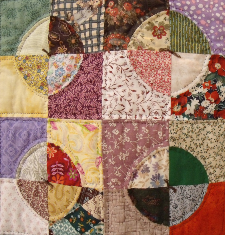 the detail here shows all sorts of small prints that are hand stitched and quilted together then tied with thread in the centres – I do like ties in quilts.