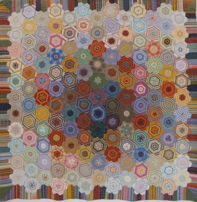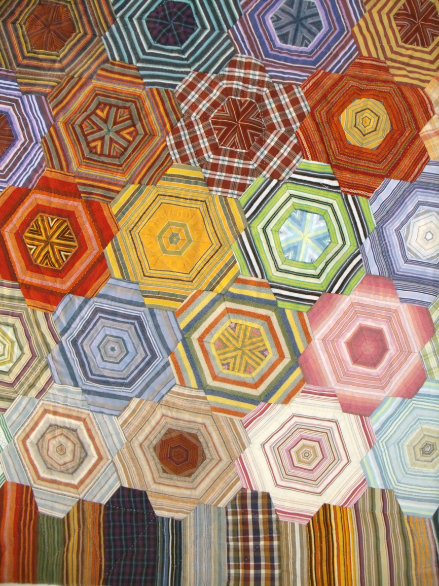Brilliant use of striped fabrics for traditional hexagon patchwork.