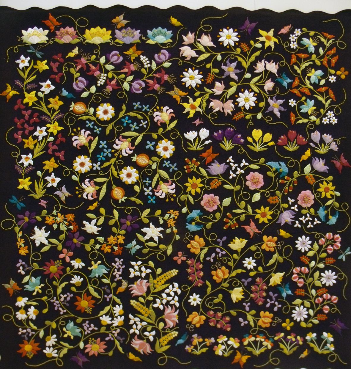 Here are hand stitched applied flowers in traditional designs, very beautifully controlled and as playful as they are elegant. It is reminiscent of 17th century embroidered bed covers.