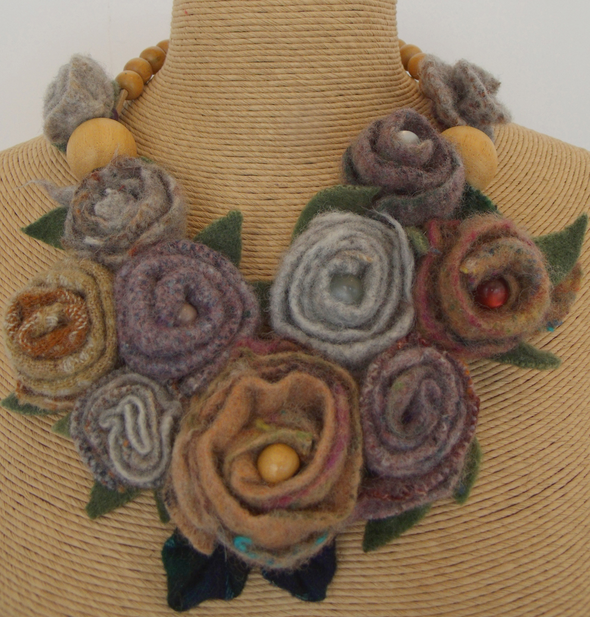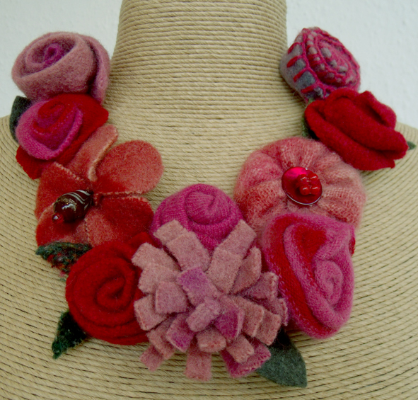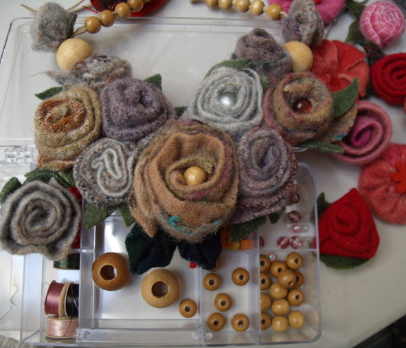 I inserted my knitted roses between Kirsten’s more substantial felt blanket ones, ( I really like her use of the blanket stitched edge for a fat rolled rose). She had provided leaves as well so they helped make the reds even stronger. Then I simply stitched 2 suede strips for ties onto the last roses and there it is – now for the neutral necklace.