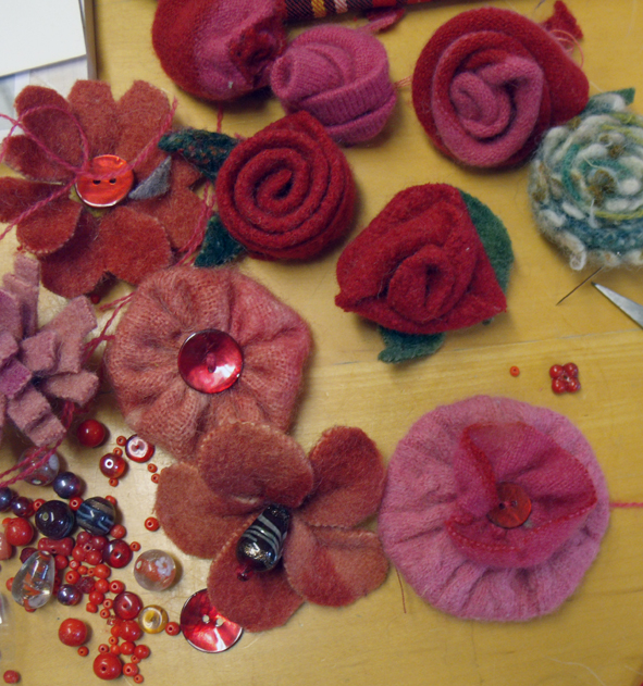 I was really getting into my stride, and now I just want to make more of these simple flowers pieces and I didn’t use the lively red tartan rose – so now I need to pluck up courage to felt my  tartans and paisley scraps to use with my old washed out jumpers……