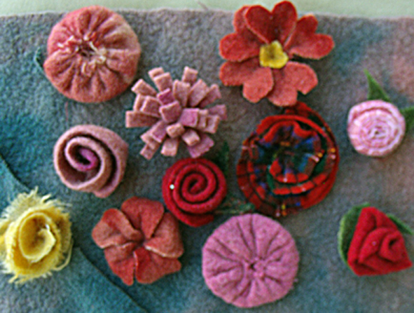 I decided to felt it by boiling it twice. The colours are so vibrant that I just had to try to find a use for it and I found the perfect solution when designing with some lovely felted woolen blanket flowers that Kirsten Hill-Nixon had brought along as a new idea for a class at Heart Space Studios.