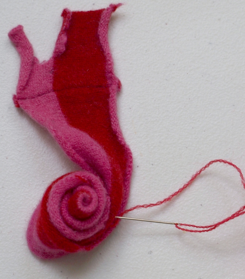 I set to work but when stitching them together without a backing fabric, soon realized that I needed just a few more roses….then I remembered my old ruined cardigan. I cut the sleeves into ribbons of different coloured stripes and stared to stitch the rose buds by simply rolling and folding the strips to suggest overlapping rose petals.