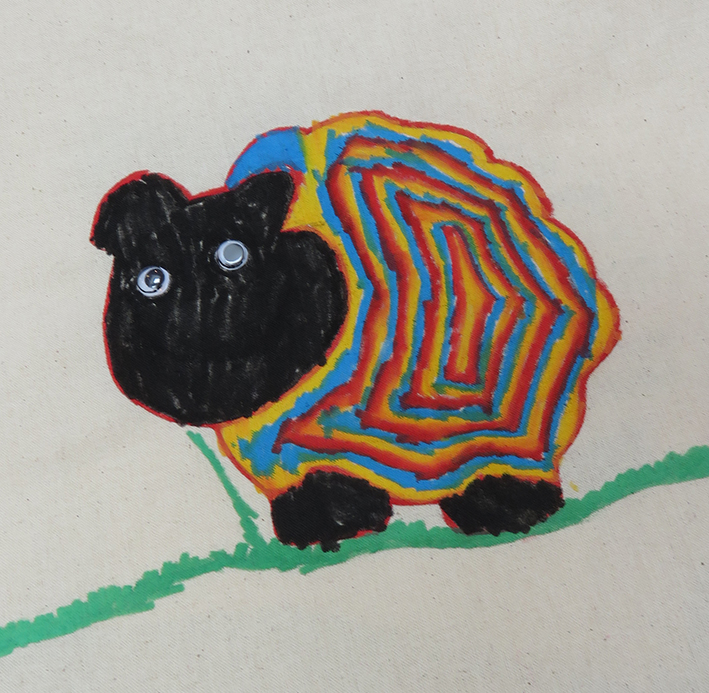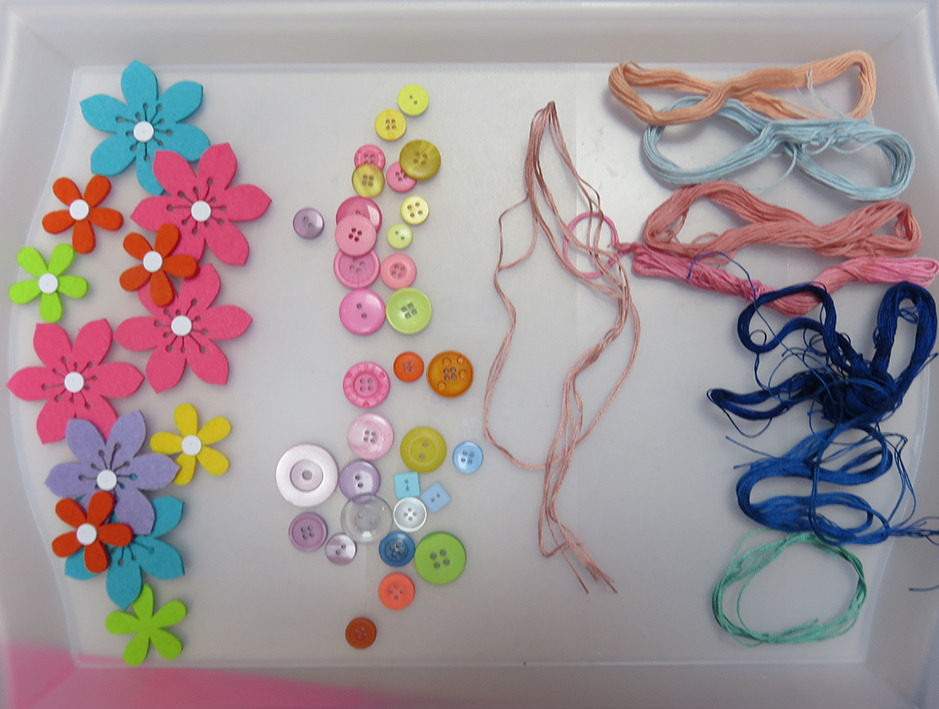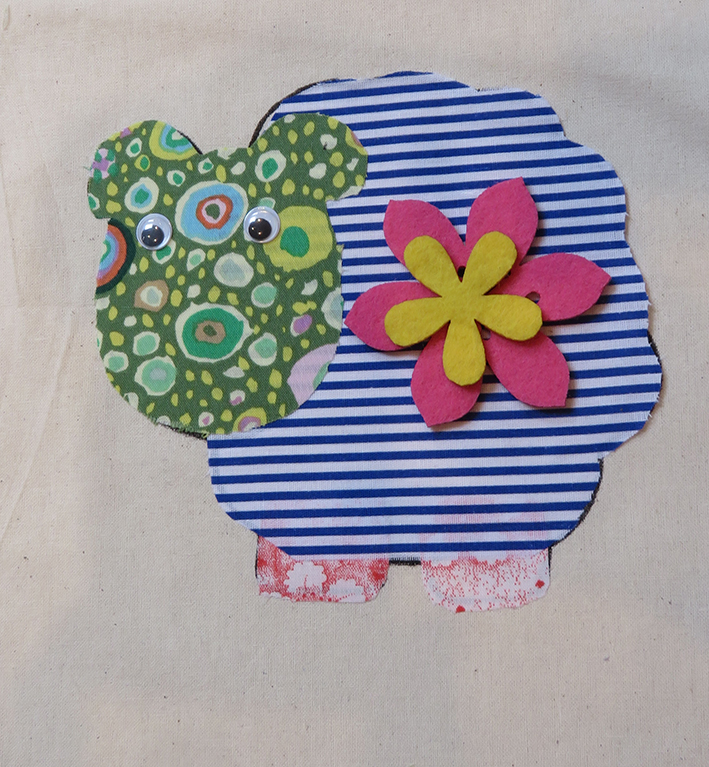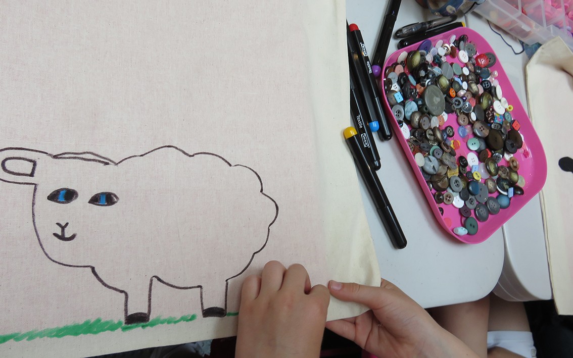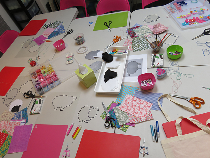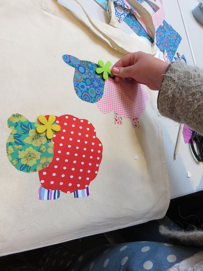 we had provided sheep patterns for the sheep, prepared fabrics with bondaweb, found buttons beads, eyes and all kinds of stuff to play with.