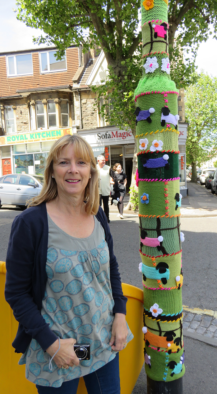 We recycled an old length of knitted bunting by giving it a really good wash and then Paula made lots of crocheted flowers which I stitched into place to liven it up; we are really pleased with our efforts and all our neighbours are delighted to see our new bunting, they keep photographing it…..the local children come and hug the lower area of the lamppost and we made this particular design as all proceeds for Shawn go to the Bristol Children’s Hospital