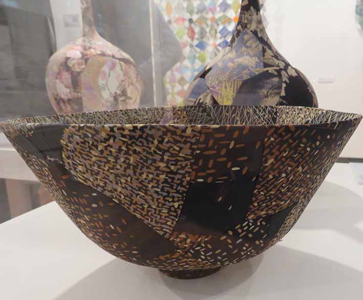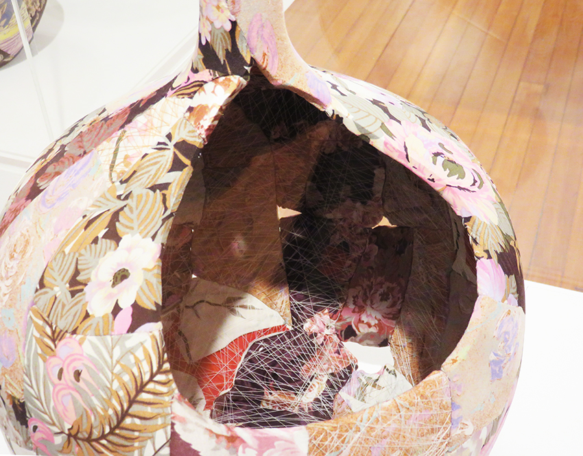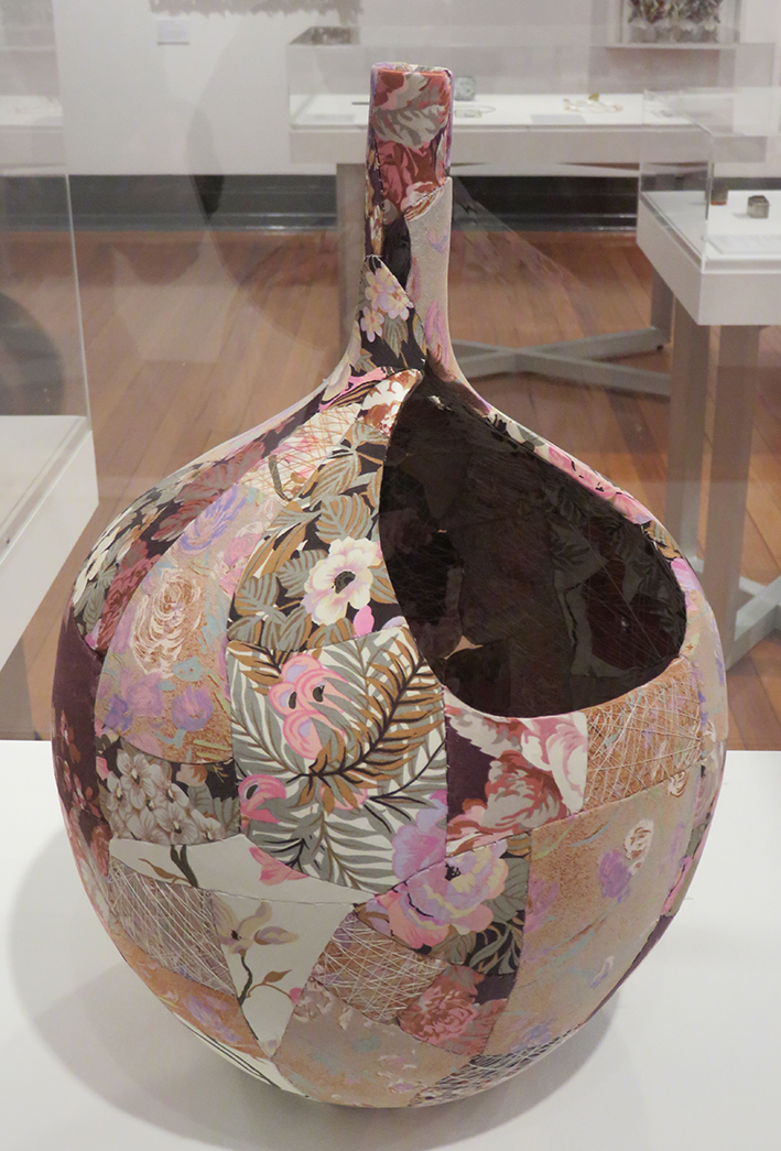 I really appreciated this work, especially her dense stitching on the inside of the pieces, used to draw the fabric tight against the curves, she managed to make this as decorative as it was functional. Just so desirable and a perfect transference of materials and ideas – and she made the jars then smashed them herself!!