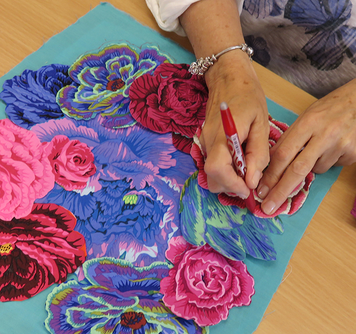 I started the day by taking all the participants to the museum’s Quilt Room to see the original quilt and explained some of the techniques we would cover. I explained my technique of hand stitching over the raw edges of the bonded motifs, which is easier than the original way of turning a small hem and stitching onto the panel. They were asked to design their own version of the appliquéd flower and shell panels – but not the central Kaffe portrait.