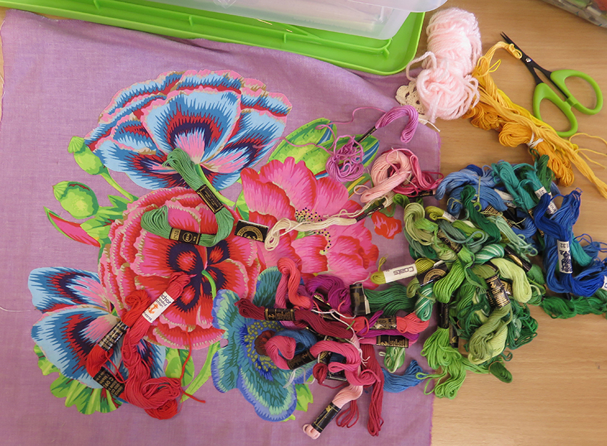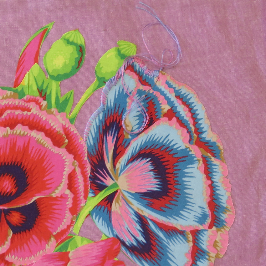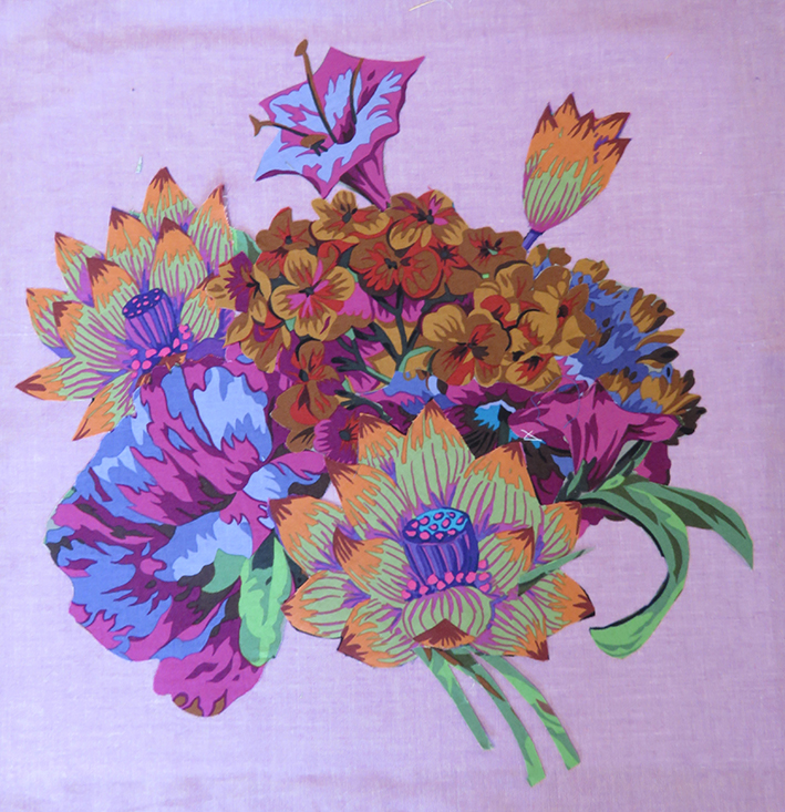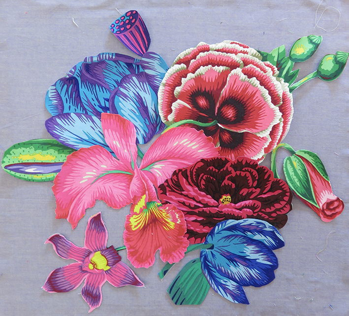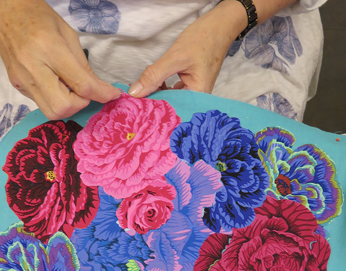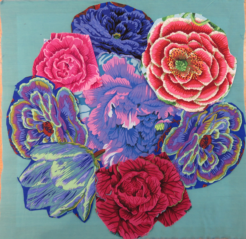 As part of the activities developed for the current Kaffe Fassett exhibition at the American Museum in Britain I am giving 2 separate day workshops to make a small panel of hand appliqué flowers. I am supplying the same fabrics used for the large scale appliquéd quilt that I made for Kaffe to celebrate his 80th birthday.