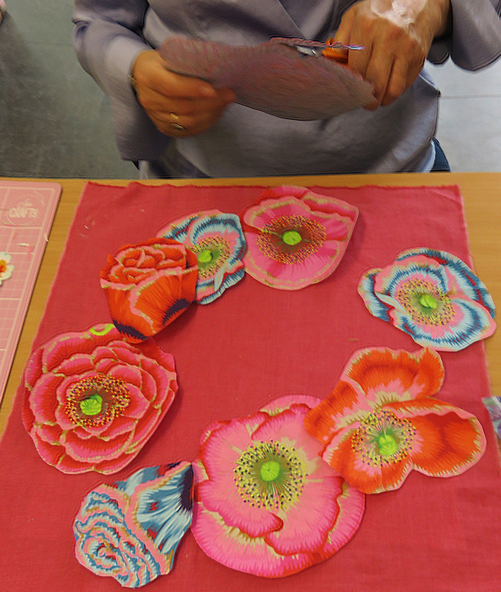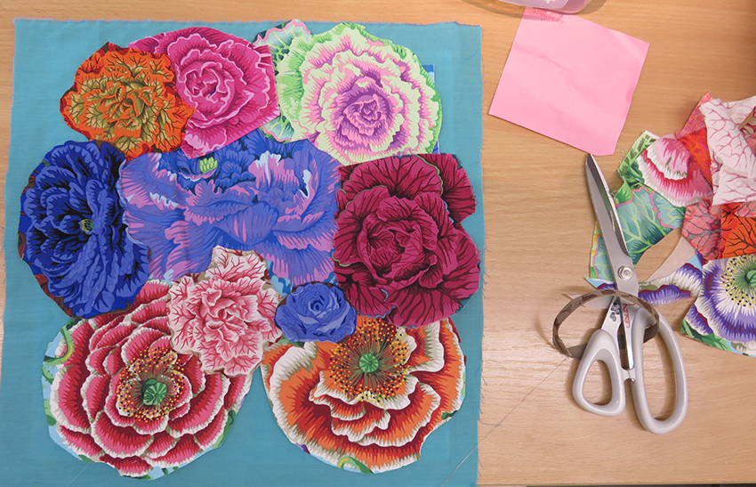 The first thing I noticed was that most people put far too many flowers onto the fabric squares with odd gaps between. I had to keep reminding them that this was to be a hand- stitched appliqué and to think about the work involved to finish the stitching later at home….. but even so most people favoured lots and lots of flowers, below shows some work in progress.