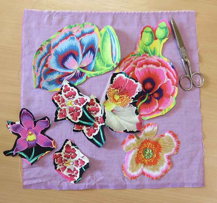 I had prepared a whole sheaf of flowered fabric by pressing heat transfer paper onto the backs of them so they were ready to cut out. I also took the remaining motifs I had cut, but not used, from my quilt. Plus a selection of different coloured squares of Shot Cotton for the backgrounds, these I backed with a woven cotton interlining to strengthen them for appliqué to be sewn without a stretcher or hoop.
