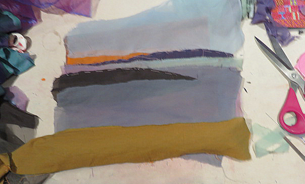 I tried many variations of colour scapes from my earlier drawings. I liked the glistening nylon shot fabric for the water, trouble is that the water of this estuary is never a deep true blue, air-force blue is as good as it gets. For some reason I started with the lump on the left…so the view was of the other end of the bay where the sun sets and all the colour emerges from…but it wasn’t working for me – then one morning I just changed it around so it looked like the Battery Point headland…I was suddenly on home ground..or should I say water?