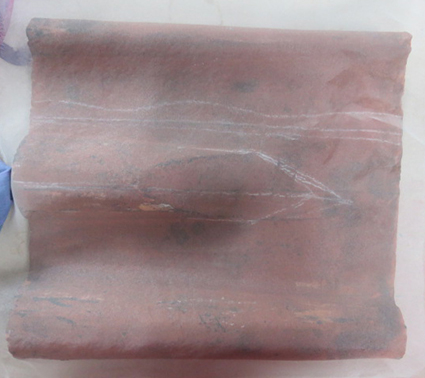 I continue to stitch down the length of the tile – it takes several days but as always fascinating to handle the colour changes. The stitching is quite large and almost crude using a heavy gauge silk thread but very satisfying to do; usually when working this technique I use one single thread of silk and it takes ages and ages to cover the ground