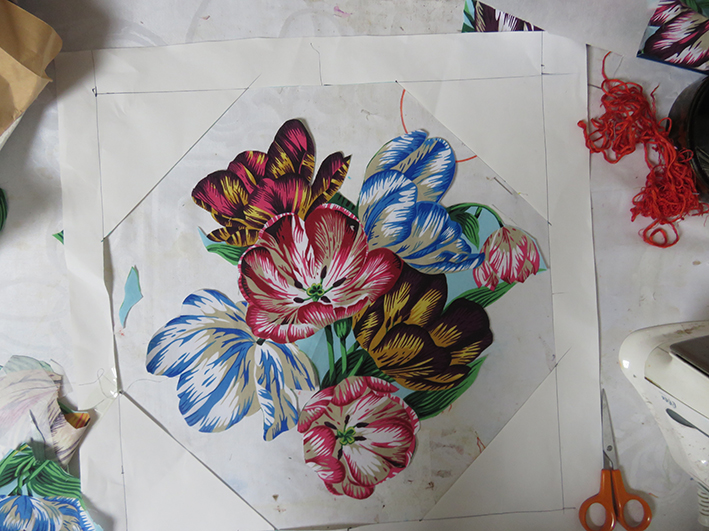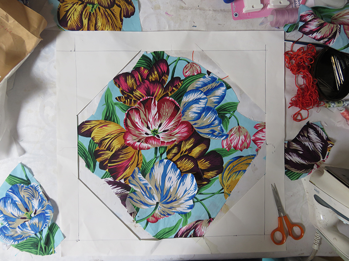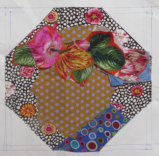 This looked miserable, and the garland didn’t fit into the hexagon very well – and then I would have to embroider the features; I remembered my ‘Flora’ embroideries influenced by Archimboldo – the artist who made faces from flowers. I tried various flowery fabrics from the Kaffe Fassett Collective.