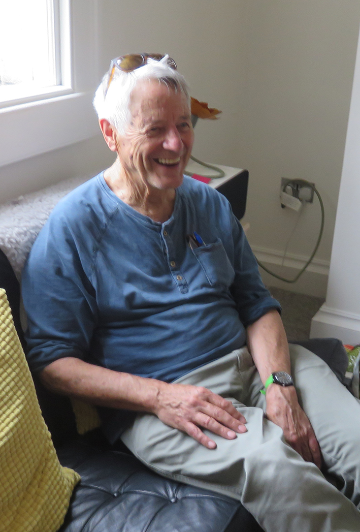 Kaffe Fassett studies new work on the quilt wall in my studio