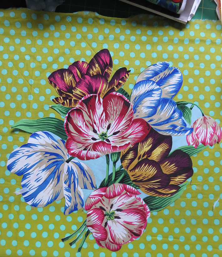 To make the bouquets, the fabric has to be backed with a bonding paper, carefully cut out, placed into position by re-arranging the various elements to fit harmoniously, pressed, then hand stitched around each raw edge, the stitching is quicker than the arranging and my idea of blissful work.