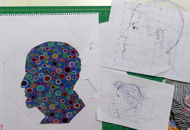 As I now had ‘carte blanche’ to interpret the design as I liked I decided to make his portrait as one of the panels. Using a recent photograph from his last visit to the studios I set about drawing and scaling the head.