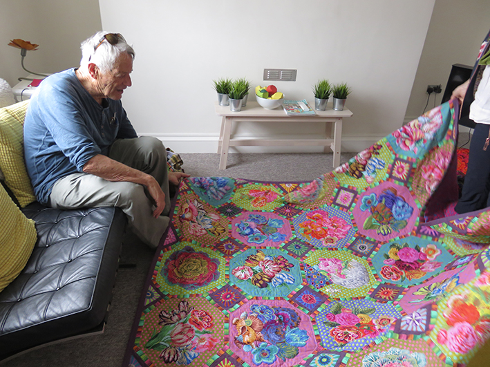 It was completed in March 2018 but I had not time to deliver it; then Kaffe was awarded an MBE and I know I have to include this – so back again to the finished quilt