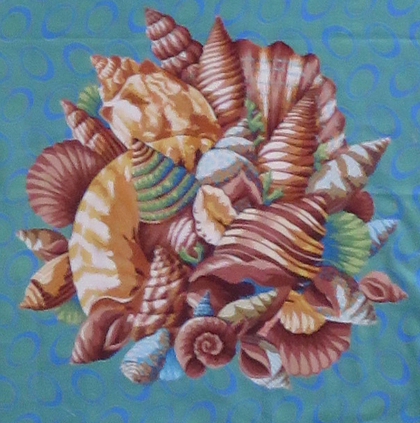 By September I had eventually made my fabric decisions, I had to make multiple versions of some of the panels – all in different colour-ways, but this gave cohesion to the busy design. I also added 4 shell corners, this was possibly the easiest panel to apply as the size was perfect and the shape fitted – just a few additions to balance colour.