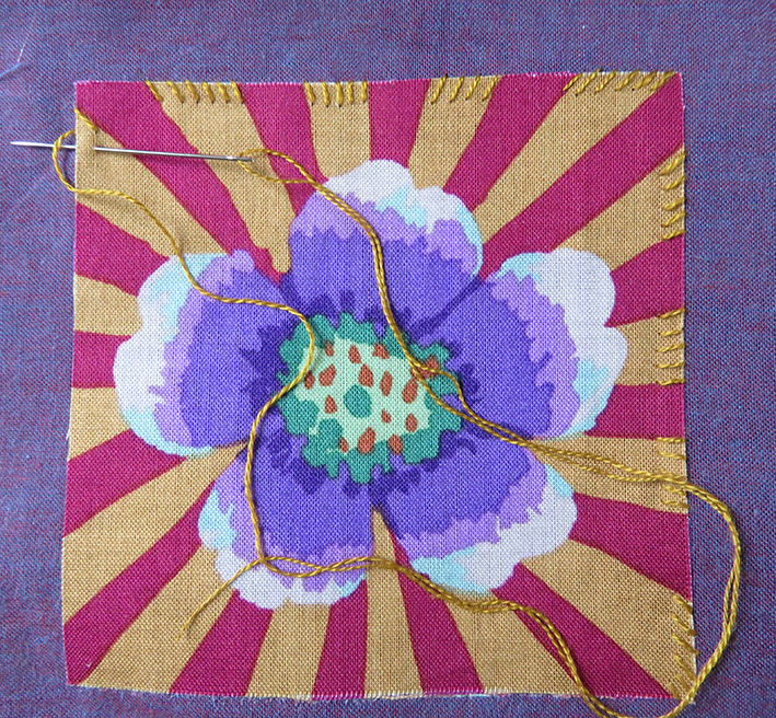 As part of the activities developed for the current Kaffe Fassett exhibition at the American Museum in Britain I am giving 2 separate day workshops to make a small panel of hand appliqué flowers. I am supplying the same fabrics used for the large scale appliquéd quilt that I made for Kaffe to celebrate his 80th birthday.