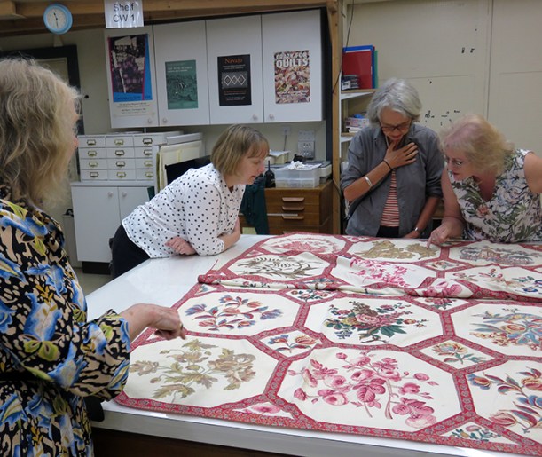 I started the day by taking all the participants to the museum’s Quilt Room to see the original quilt and explained some of the techniques we would cover. I explained my technique of hand stitching over the raw edges of the bonded motifs, which is easier than the original way of turning a small hem and stitching onto the panel. They were asked to design their own version of the appliquéd flower and shell panels – but not the central Kaffe portrait.