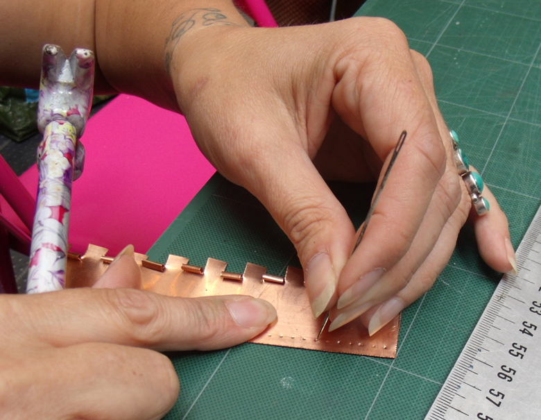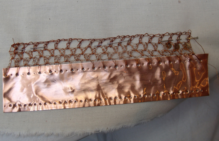 pre machine knitted lace, crocheted copper wire with copper foil and wall paper – Steph Wooster.