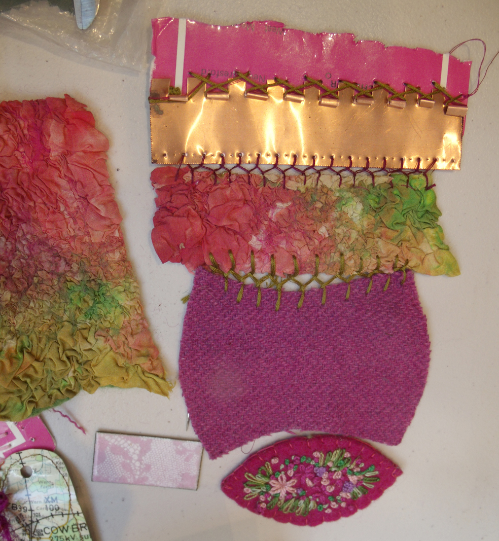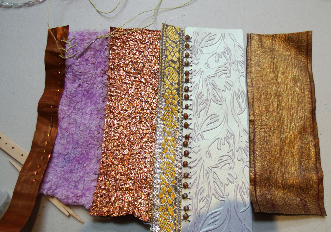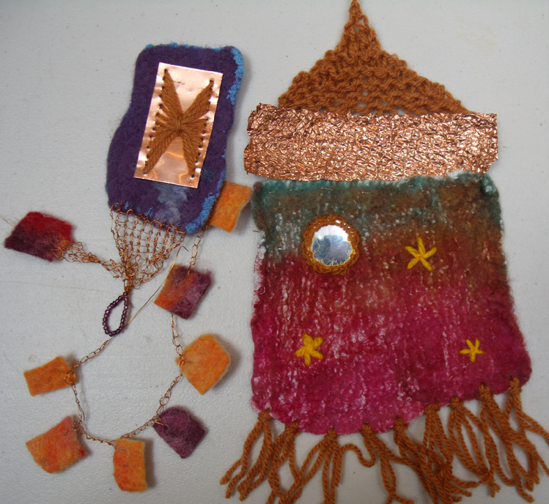 various knitted materials for joining disparate materials;- copper, copper wire, silk and wool nuno felt, shisha mirror in wool embroidery – Clare Griffel
