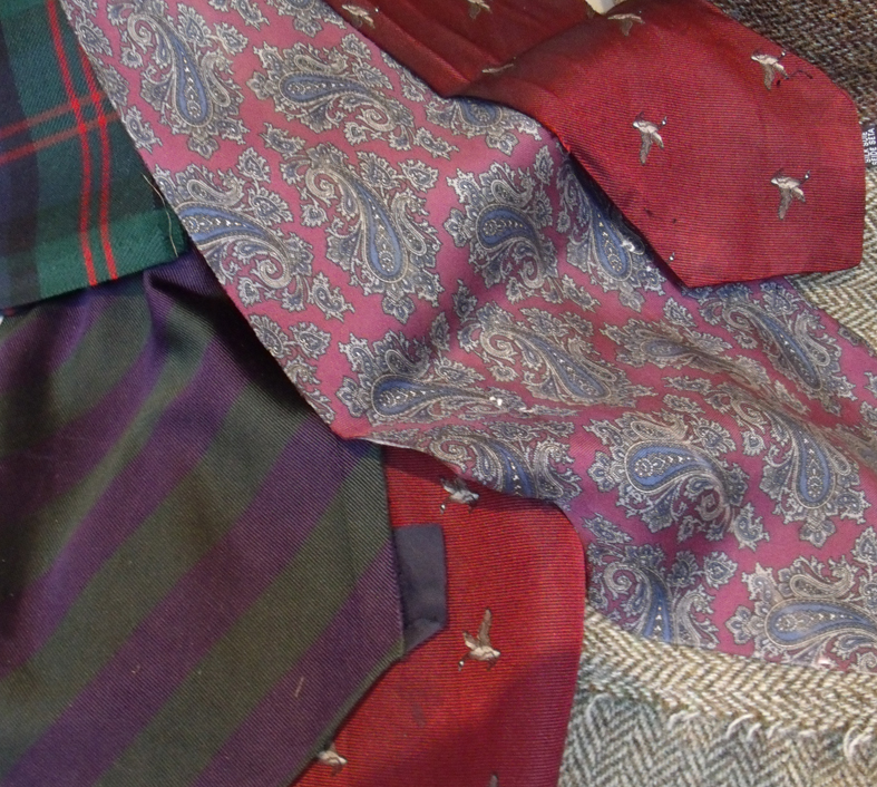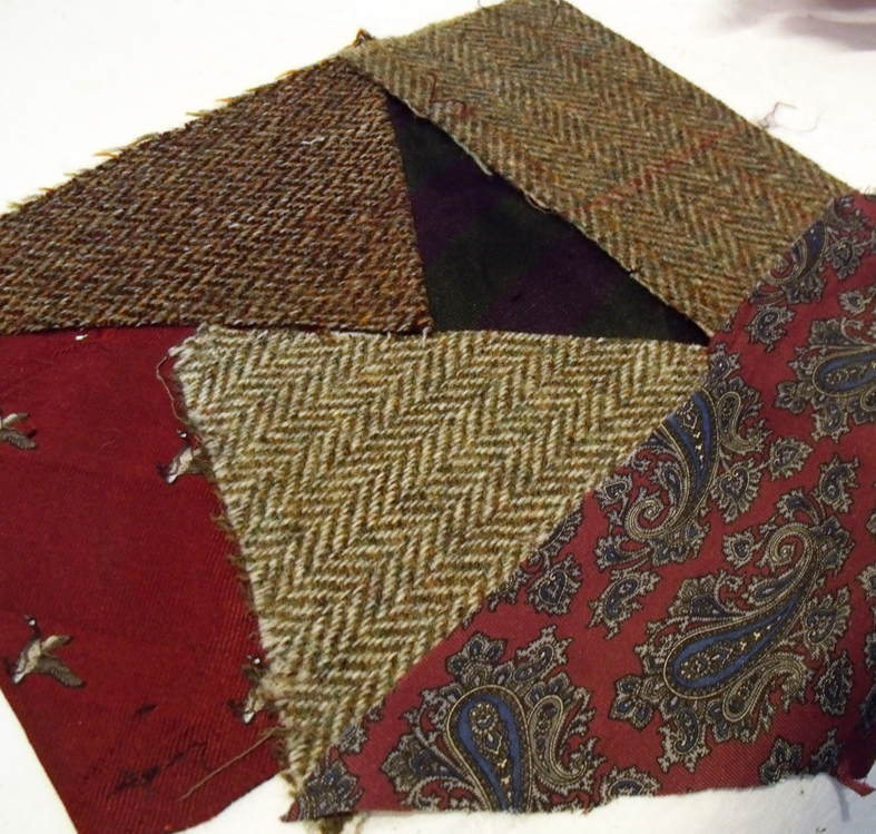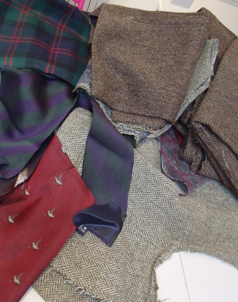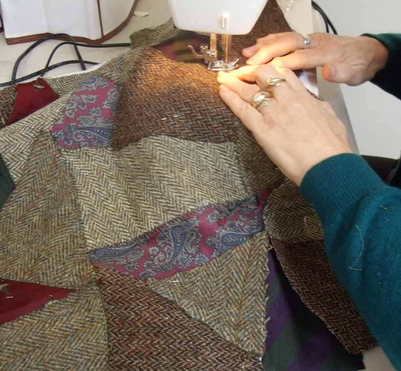 I was very pleased to be asked to conduct a one-to one session with her to help cut into the jackets and organise the patchworks. I knew it would be really difficult so I volunteered to cut into them for her , suggesting that she make a start by unpicking and when she arrived she had carefully unpicked and pressed them all; 3 beautiful tweeds in soft shades of beige, grey and brown and she also brought some club and military ties that she had been unable to part with, and a piece of her husband’s Scottish clan tartan.