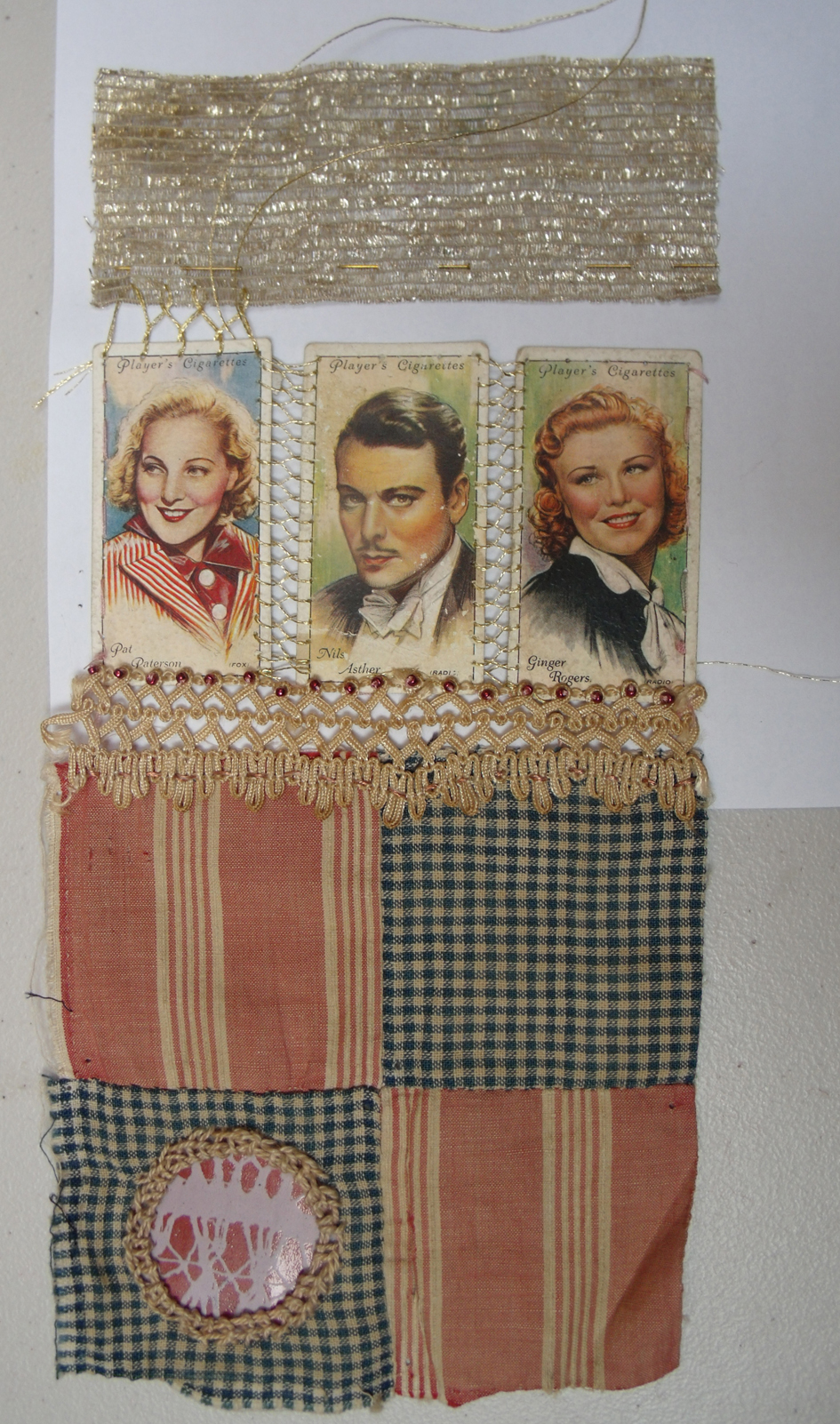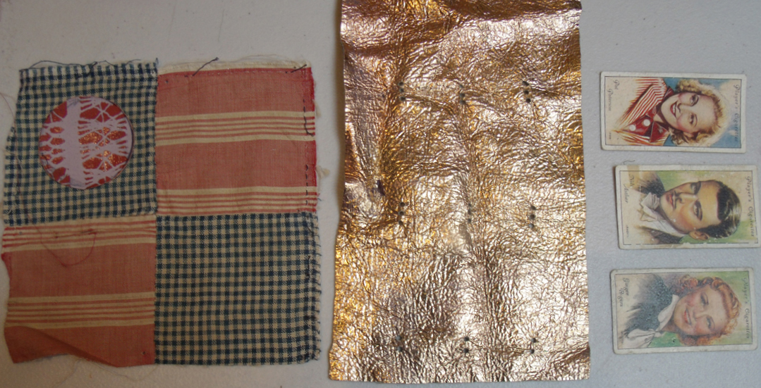 all things vintage – patchwork cotton, linen thread appliqued enamelled copper circle , cards and silver fabric. Sophie Bristol