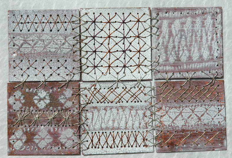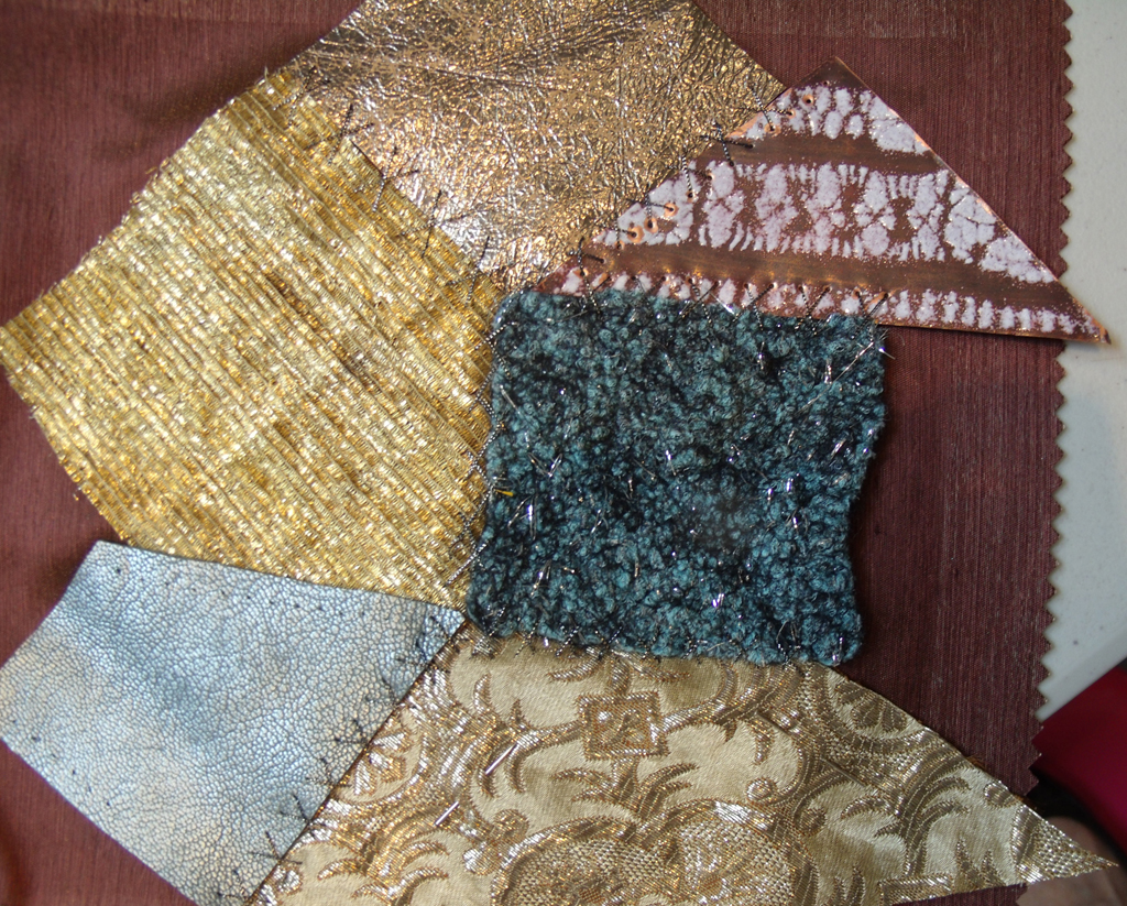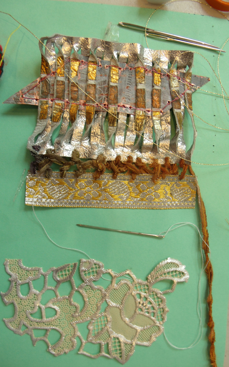 So now it is over to me to develop the new fabric, I start by placing the different pieces in formal patterns – I originally intended to use wire to stitch between the gaps using decorative lace like stitches to fill in any spaces….now I realised this was not going to be at all easy, even at this moderate scale. The wire won’t behave well – it needs careful and regular stitches to develop the rhythm required to give embroidery its formal beauty.