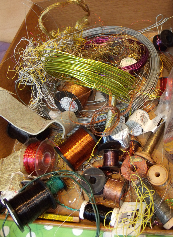 For the FIRST WORKSHOP I started off with the absolute basics, first we chose the colour scheme – I supplied various ribbons and fabrics for people to choose a small group of their favourite colours: this takes longer than anyone imagines it can and causes a lot of negative ideas to flow as people are usually very nervous about using colour, but I have learnt that this choosing is really important as eventually by using the same set of colours in various patterns and proportions the finished piece can be made harmonious.