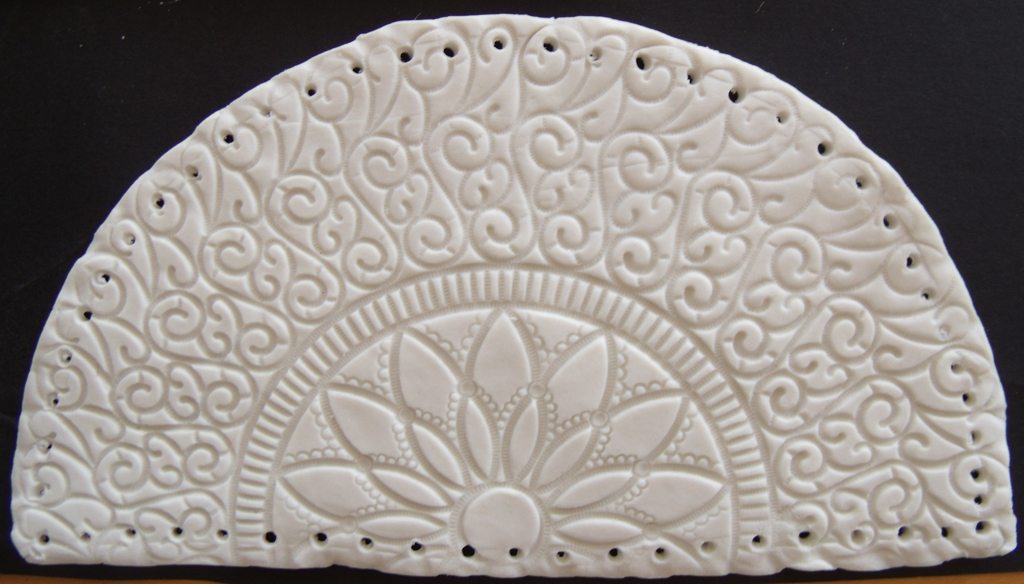 So Hanne prepared some sheets of paper porcelain for us to work on and we set to work rolling several types of lace and drawn thread work into the surface of the clay.