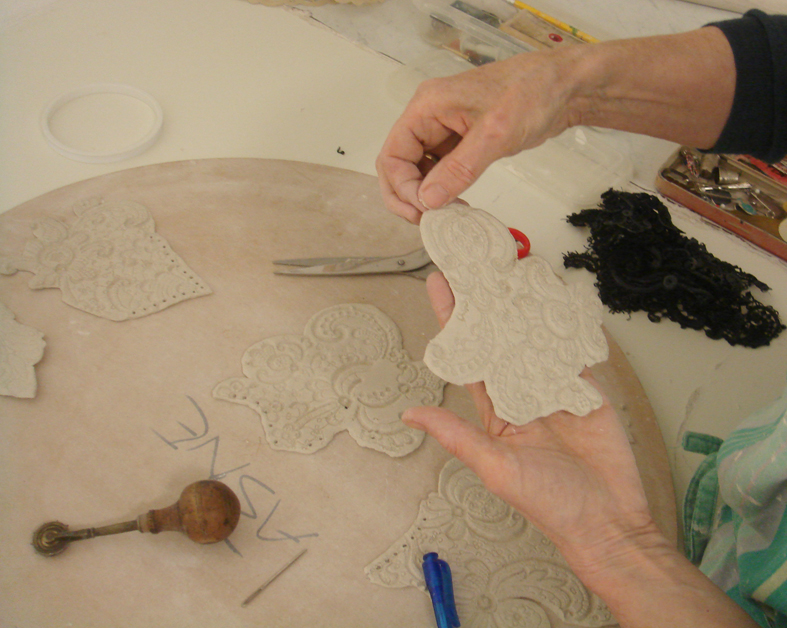 As you can see the first impression in the damp clay is stunning, so crisp and clear, we were whooping with delight at the fine detail, every stitch can be seen and this is machine made lace. We now had to cut the lace into shapes and I was amused to see Hanne pick up a pair of scissors to cut it; but first I handed her an old fashioned tailor’s tracing wheel to impress regular holes in the surface where I have to stitch. We placed the holes anywhere we thought useful – we will have to regulate these more carefully on the finished work.
