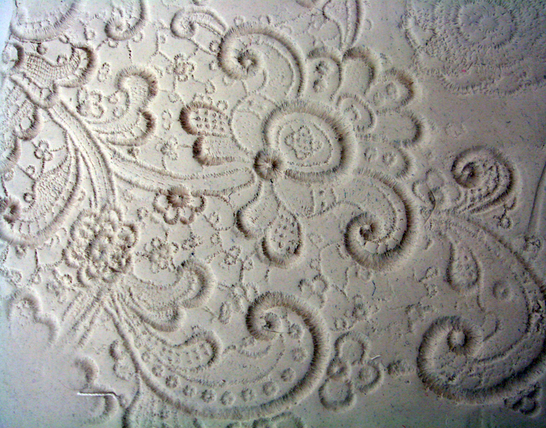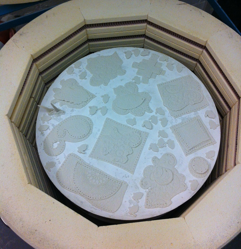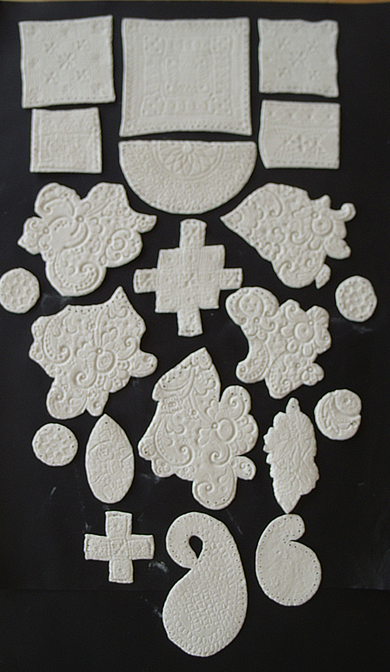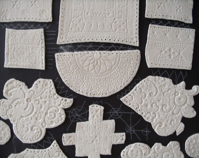 We used all types of patterns to give ourselves a good range to sample with. We needed to ascertain how big the individual pieces could be as this would give an indication of the size of finished piece…I had envisaged a huge floor to ceiling drop of larger sheets of porcelain but Hanne explained that making hand -sized pieces of porcelain was more viable; first the pieces need to be fired without cracking and then be strong enough to be handled later when being stitched together+all my scraps of vintage lace are damaged and small sized, but how else could I have afforded to collect such lovely pieces?