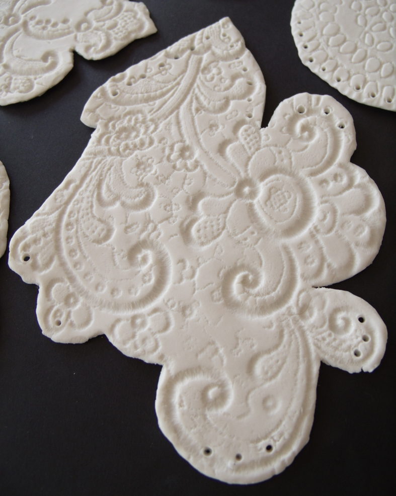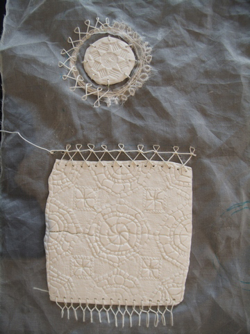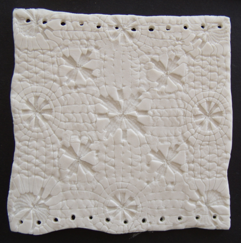 guipure lace and drawn thread squares impressed into the fresh porcelain