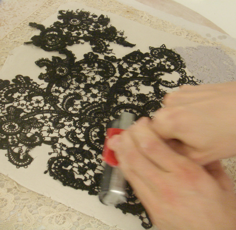 Hanne rolling black guipure lace into sheet of paper porcelain