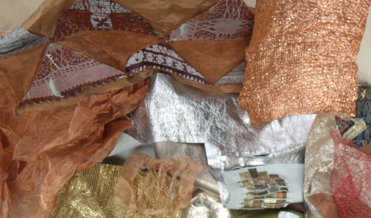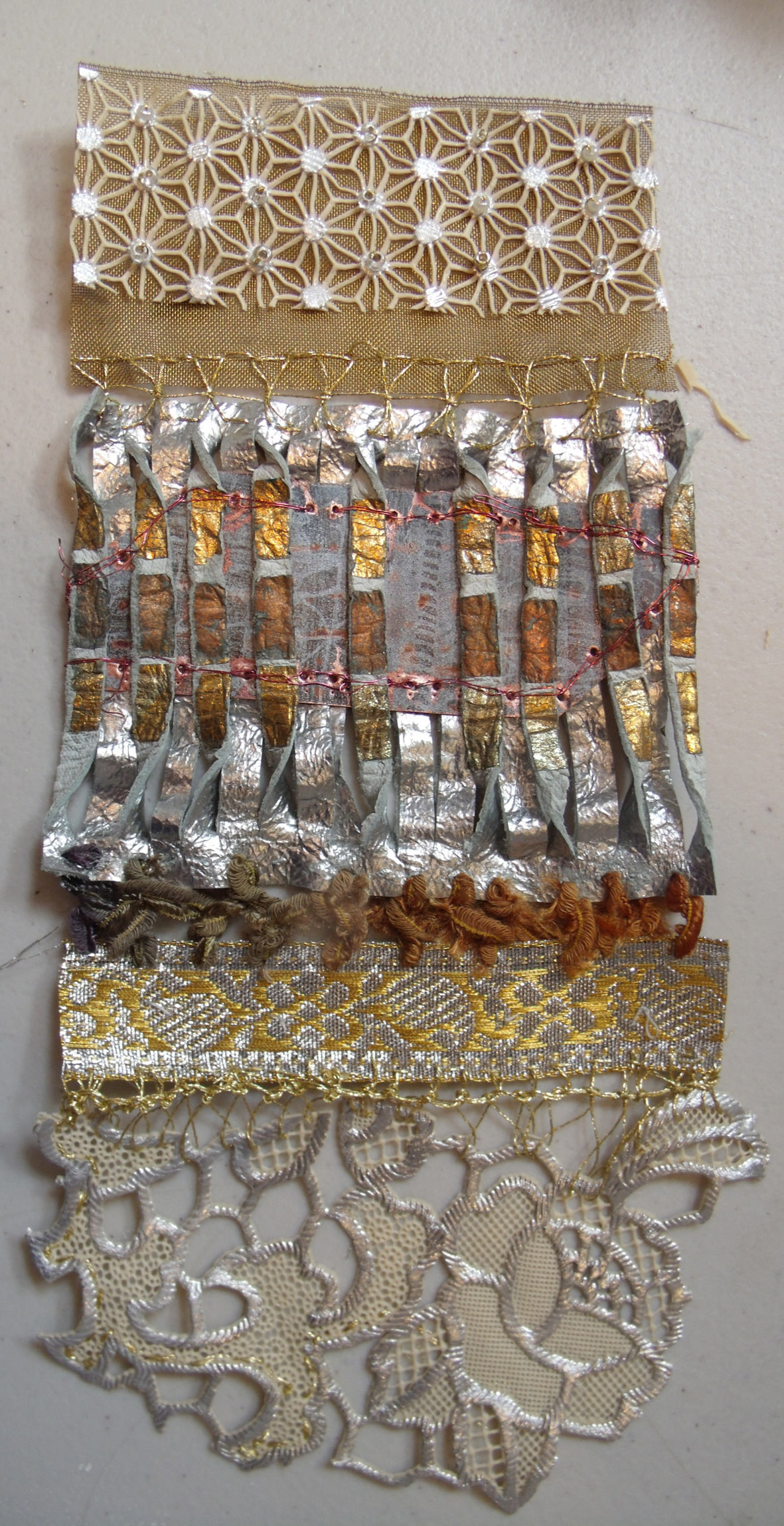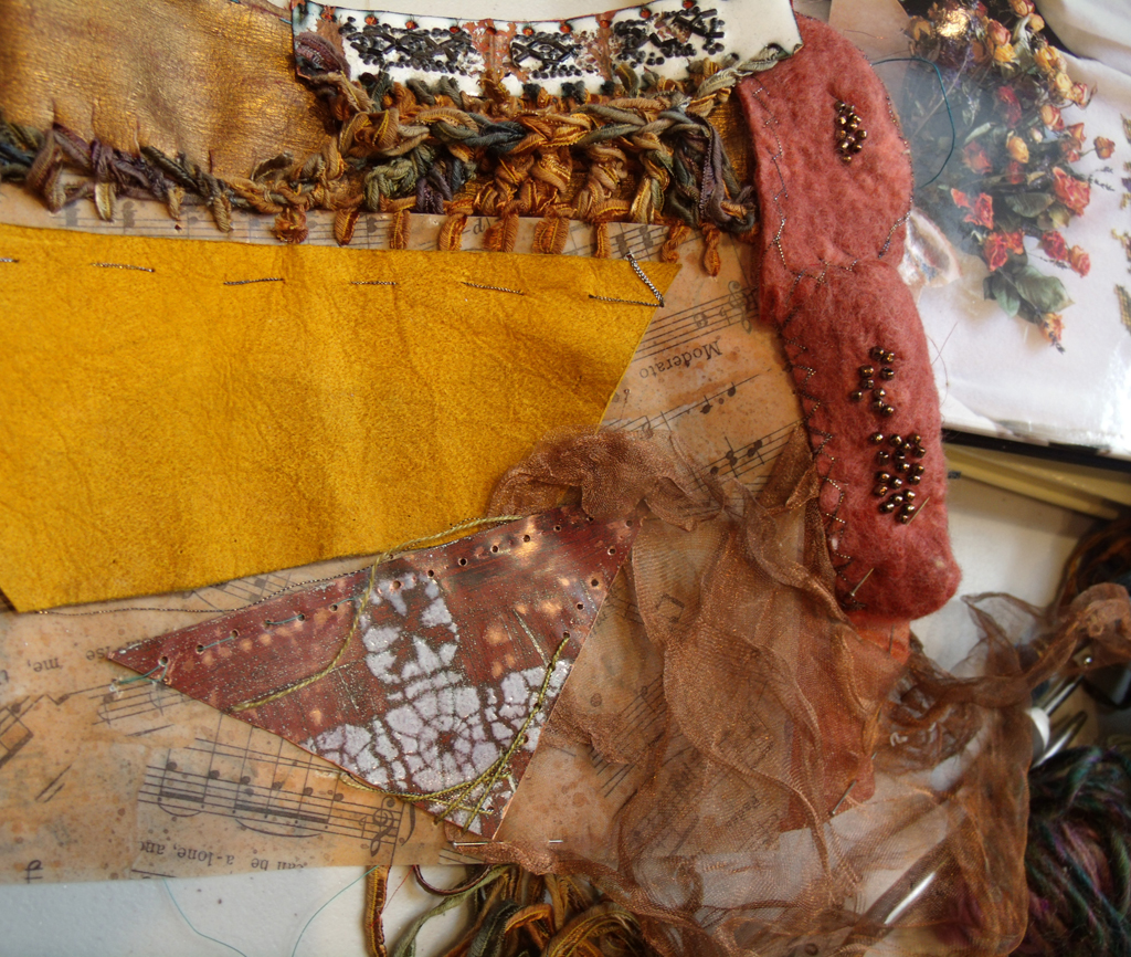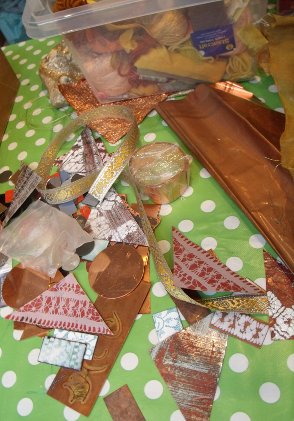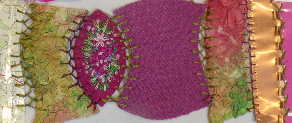 ripped card, copper foil, nuno felted silk and wool, tweed and hand embroidery all joined together in crazy style – Kirsten Hill-Nixon.