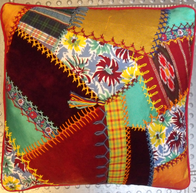 We also discussed putting a message or an initial onto the piece, and I explained how in the Crazy tradition there are lots of written messages..so she is writing her husband’s initials on a corner piece of each cushion, but has just emailed me to say that her daughter wants her to just write ‘Dad’ on hers.