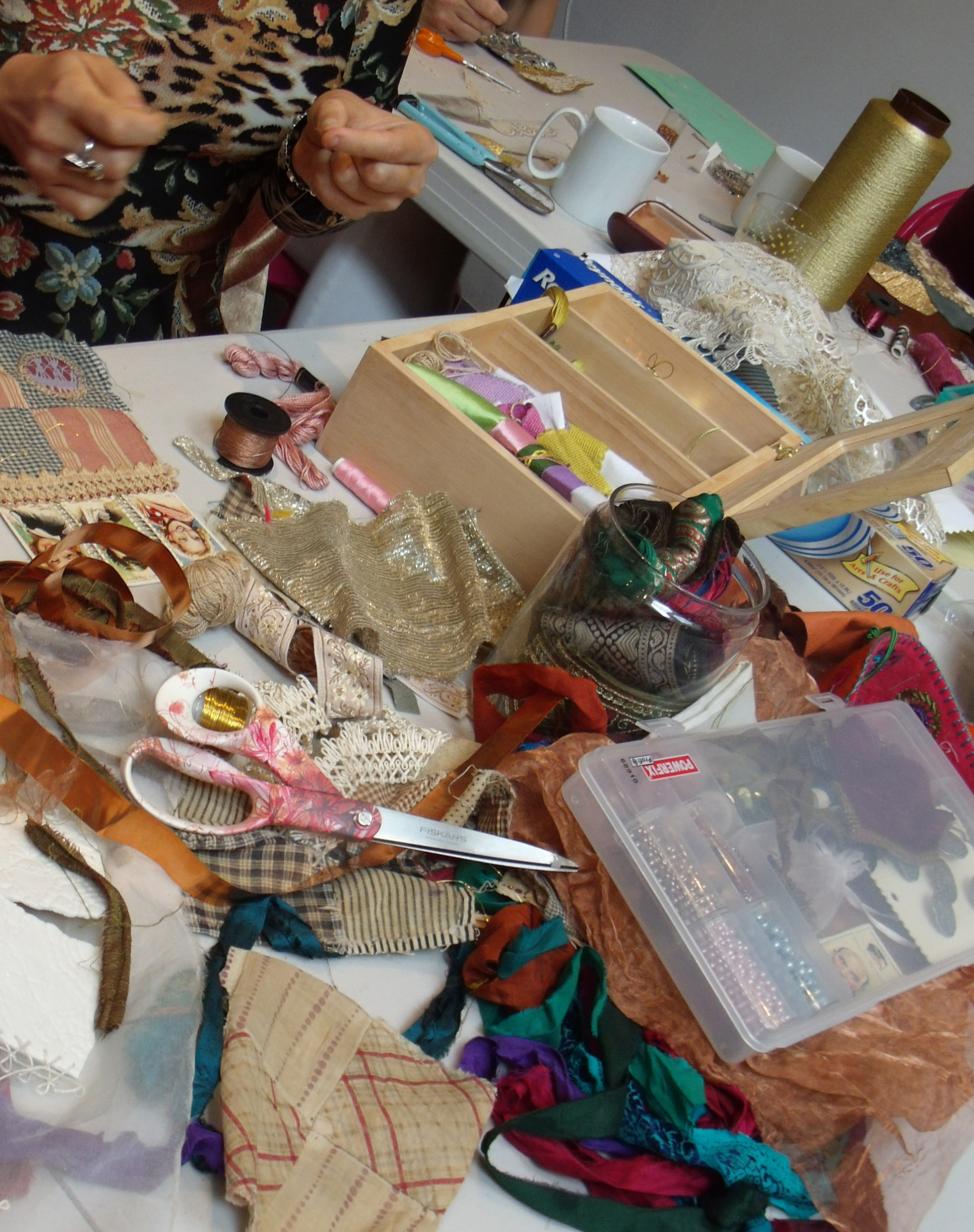 This group of students want to learn more stitches and techniques so I am running an advanced course for them – and other more experienced embroiderers can drop in for single sessions. Considering that this group had only 5 classes for 3 hours each they have really advanced their practice in many ways and not just by learning how to stitch. I think that they have caught my bug – the embroidery bug – and are now developing their own libraries and stashes of materials ready to try out new techniques and new ways of expressing themselves.