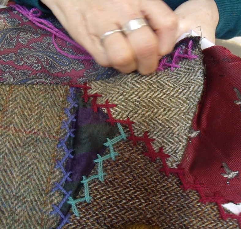 crazy patchwork with ribbons hand embroidered into position between the patches of shot cottons