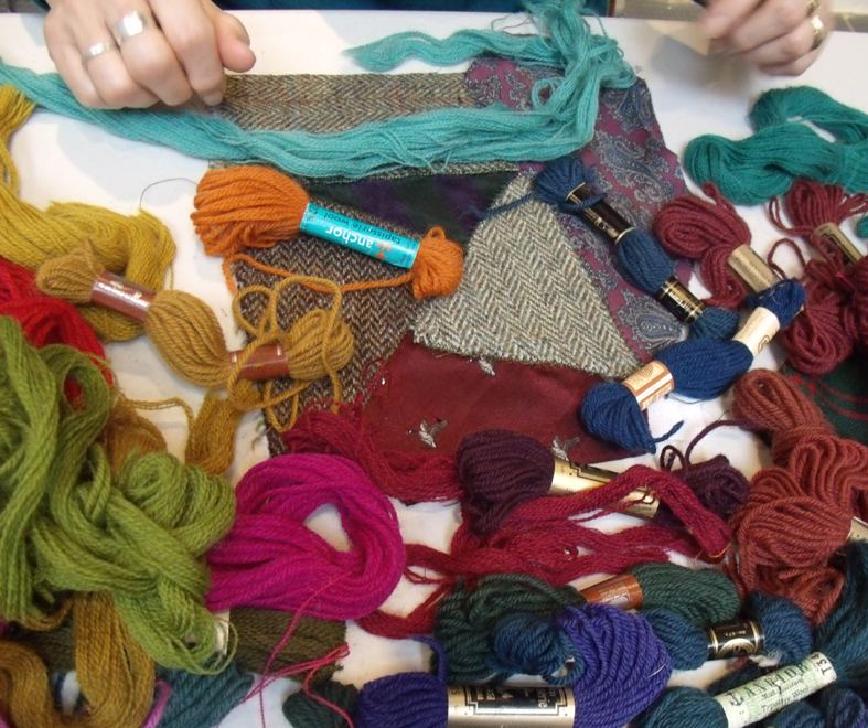 But the most important thing of all for the success of the project was selecting the colours of the embroidery yarns, they had to be chosen and tested. I had brought several types of woolen yarns for Jane to sample, the usual tapestry 4 ply and some crewel wools that can be used singly or in multiples, very useful for developing colour combinations. Looking at the colours embedded in the tweeds it was a real pleasure to try to match them ..and at first the pale turquoise crewel yarn seemed the best choice