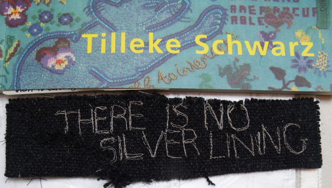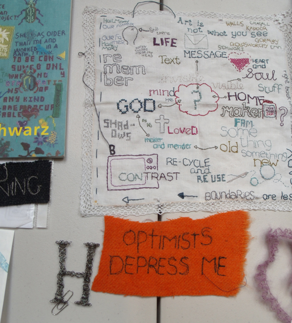 Before Caroline come to the tutorial I asked her to bring some inspirational objects or documents as well as evidence of her personal research – fabrics, photographs, books, drawings, scraps books, old work – whatever made her want to commit to actually making her ideas. She brought several telling things and as she unpacked them I started to make groups that showed how her own work connected to what she had brought along. Tilleke Schwarz ( on of my own great favourite embroiderers) had evidently been a real influence, in fact Caroline has attended on of Tilleke’s workshops in England. She had translated Tilleke’s acerbic but generally neutral stitched commentaries and slogans to make her own negative statements…