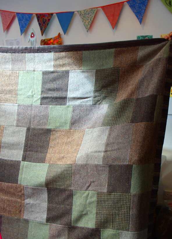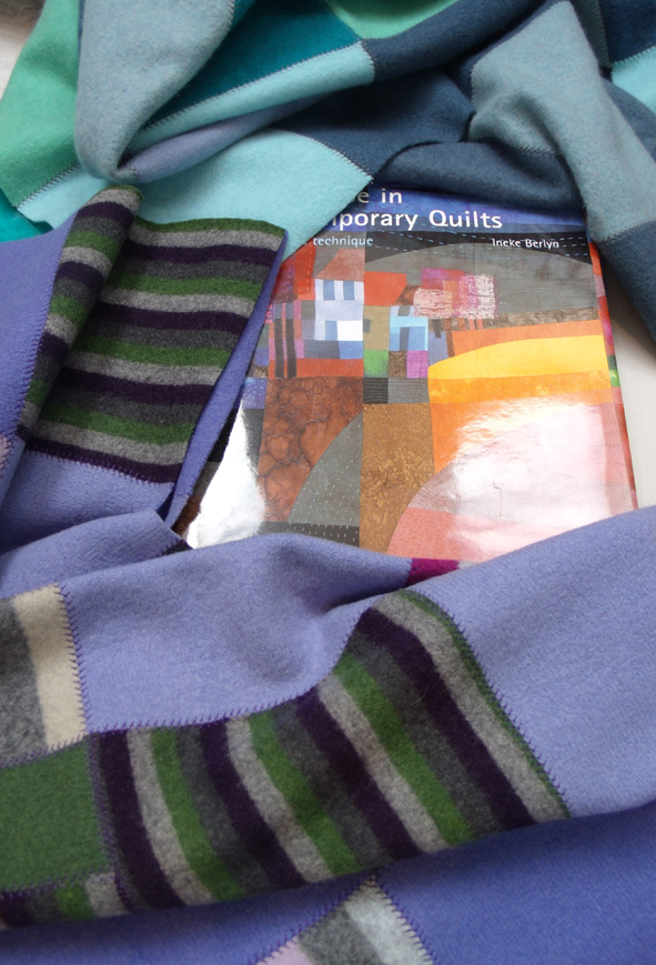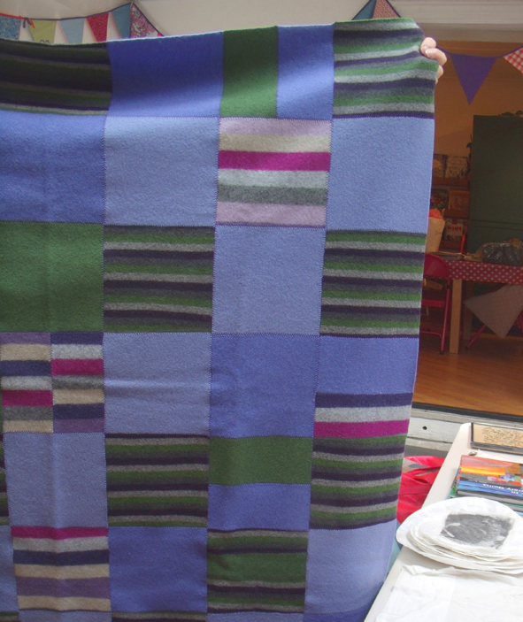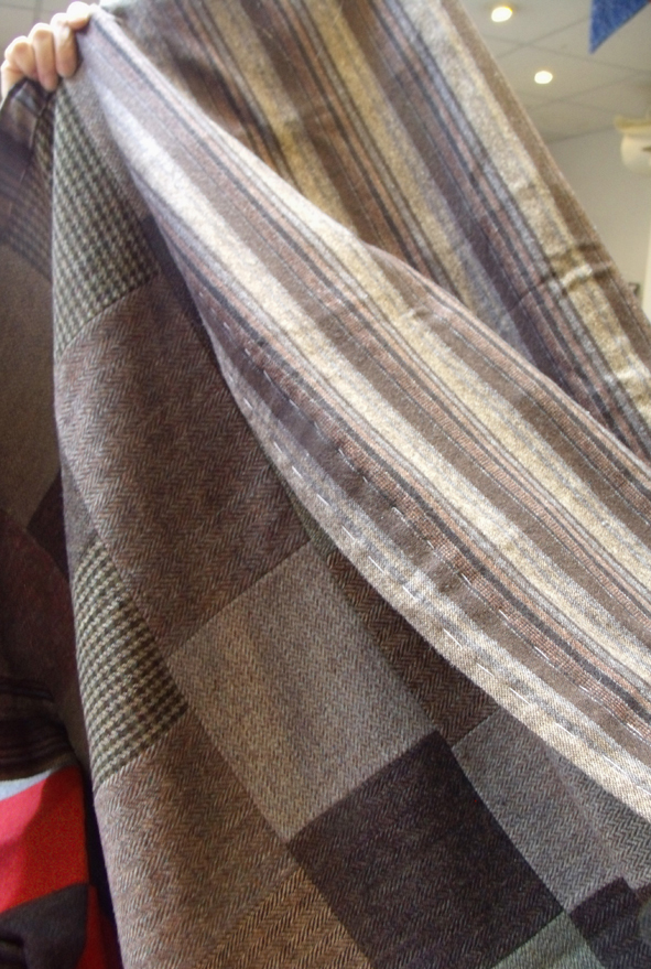 I was now considering how to help develop these disparate sets of materials and concerns into a more cohesive textile context, obviously some form of collage, applique or mixed media patchwork….when, as sometimes happens at the studios, we had 2 visitors from ‘Billie Jean’ which is a lively Bristol vintage clothes and fabric shop, they had been sent to us to show some things that we might be interested in seeing; and these were….. patchworks. Asking Caroline’s permission, I invited them in to see some absolutely lovely recycled tweed and knitted cashmere patch-worked blankets, that Billie Jean herself had made from their stash of old cashmere knitwear and woolen jackets, we were soon all chatting away about recycling, the beauty of old fabrics and how much we enjoyed the experience of just handling and making with textiles.