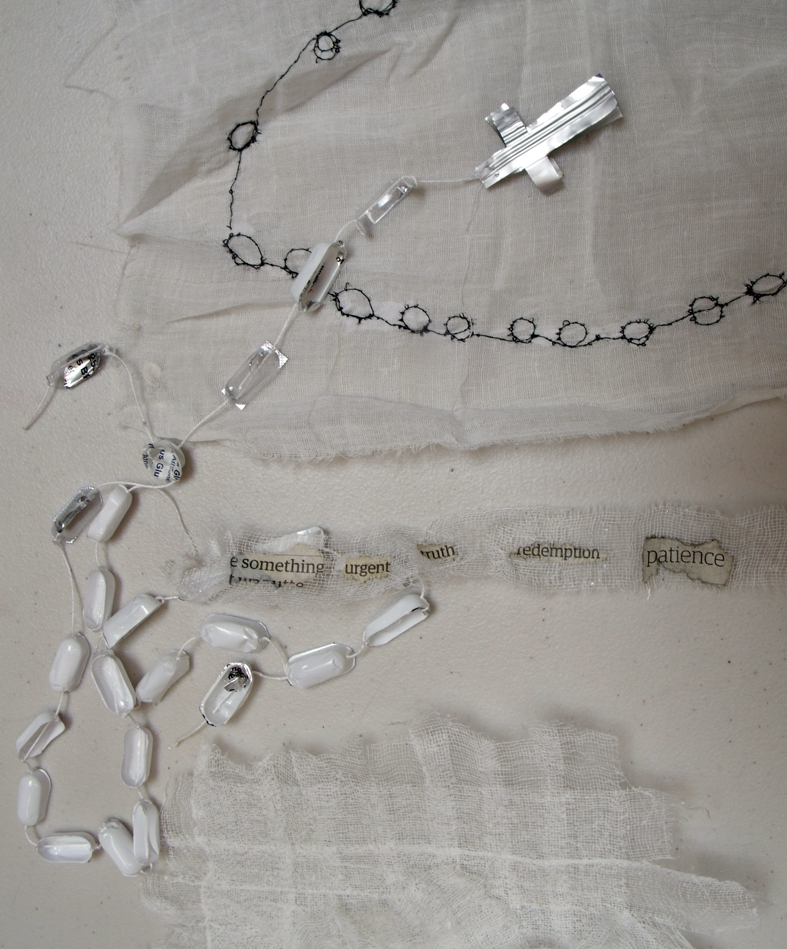 This set of work looked very different from the first work that had been brought out – a mixture of different media about all connected to her very strong family affinity to Ireland and her grandmother’s home. I was struck by several “necklaces” and embroidered images that made me think of rosaries,
