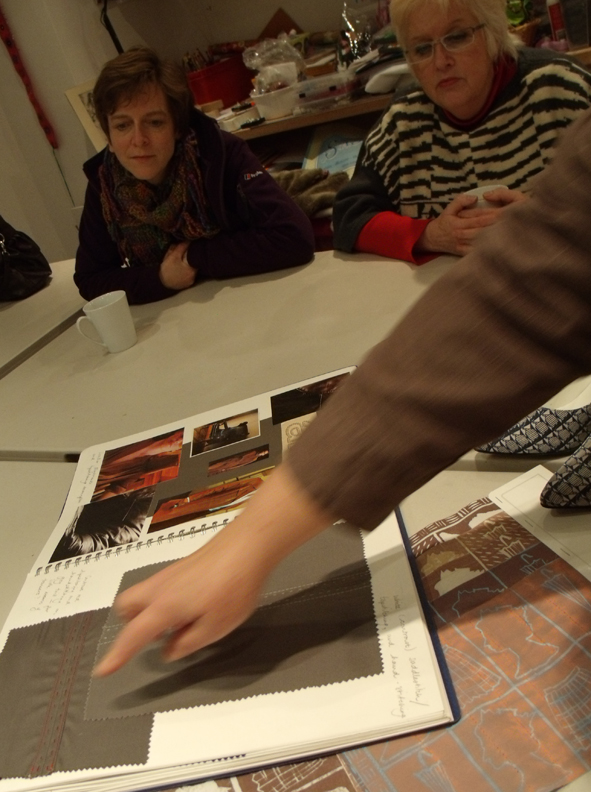 And as several of Caroline’s inspirational books had been about patchwork and applique, this seemed to be a good omen for the way to go…..as part of the mentoring session we now had to decide the way forward. I advise people how they might develop the next stage of their work, it is entirely up to them if they choose to take that advice. I see my mentoring role to be that of a person immersed in the same materials, techniques and often similar subjects as the people asking advice, and having been through similar making (or not making) experiences many times I have developed several strategies for looking at the work, getting some perspective on it – finding connections and as any tutor will do – suggesting new things to research to take the work forward.